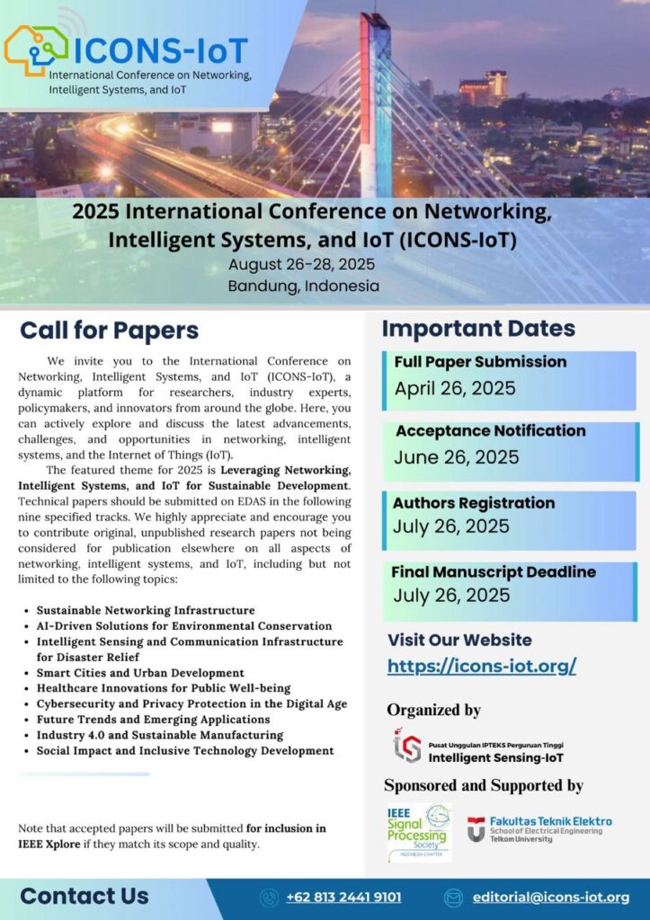 International Conference on Networking, Intelligent Systems, and IoT (ICONS-IoT) merupakan wadah bergengsi yang mempertemukan peneliti, profesional industri, pembuat kebijakan, serta inovator untuk membahas perkembangan terkini di bidang jaringan (networking), sistem cerdas (intelligent systems), dan Internet of Things (IoT).